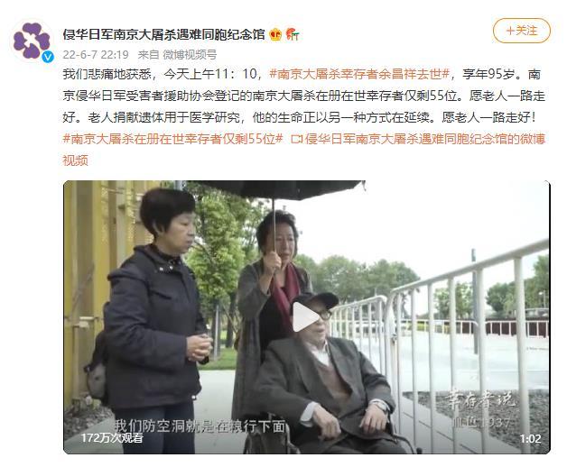 中新網(wǎng)6月8日電 據(jù)侵華日軍南京大屠殺遇難同胞紀(jì)念館官方微博消息,6月7日上午11時10分,南京大屠殺幸存者余昌祥去世,享年95歲。南京侵華日軍受害者援助協(xié)會登記的南京大屠殺在冊在世幸存者僅剩55位。