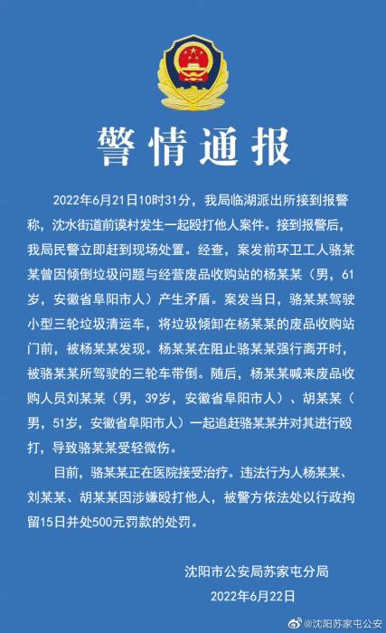 沈陽(yáng)警方通報(bào)“多人毆打環(huán)衛(wèi)工”:三名打人者被行拘