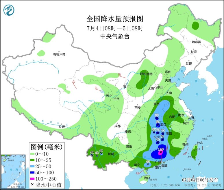 7月4日08時至5日08時,廣東大部、廣西東部、湖南中東部、江西西部和南部、湖北中部、河南東部等地部分地區(qū)有大到暴雨,其中,廣東北部等地部分地區(qū)有大暴雨(100~140毫米)。內(nèi)蒙古西部、甘肅西部、青海北部、東北地區(qū)南部、江南中部、華南東部等地的部分地區(qū)有4~6級風(fēng);東海北部海域有6~7級、陣風(fēng)8級的旋轉(zhuǎn)風(fēng),東海南部海域、臺灣海峽、北部灣、南海北部和中部海域有5~6級、陣風(fēng)7級的偏南到西南風(fēng)。