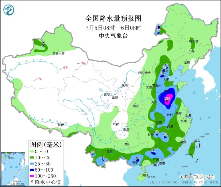 7月5日08時至6日08時,內(nèi)蒙古中東部、京津冀、黃淮中東部、西南地區(qū)南部、江淮大部、江漢東部、江南中東部、華南大部、臺灣島等地的部分地區(qū)有中到大雨,其中,山東中南部、河南東部、安徽北部、江蘇北部、京津冀、廣東北部等地的部分地區(qū)有暴雨,山東南部、安徽北部、江蘇北部、河南東部等地局地大暴雨(100~180毫米)。新疆北部和東部、內(nèi)蒙古西部、甘肅西部、東北地區(qū)南部、山東半島、江南東部等地的部分地區(qū)有4~6級風(fēng),其中,新疆東部、浙江東部等地的部分地區(qū)風(fēng)力可達7級以上;東海大部海域、臺灣海峽、北部灣有5~6級、陣風(fēng)7級的偏南到西南風(fēng)。
