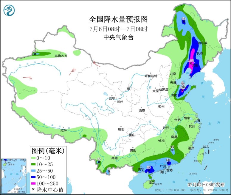 7月6日08時至7日08時,內(nèi)蒙古東部、黑龍西南部、吉林中西部、遼寧大部、河北東北部、山東、江南東部、華南大部、云南南部等地的部分地區(qū)有中到大雨,其中,遼寧大部、吉林西部、黑龍江西南部、山東中北部、廣西東南部、廣東中部和西南部等地的部分地區(qū)有暴雨或大暴雨(100~150毫米)。新疆東部和南疆盆地、內(nèi)蒙古中西部、甘肅西部、東北地區(qū)中南部、山東半島、江南東部等地的部分地區(qū)有4~6級風(fēng),其中,新疆東部、浙江東部等地的部分地區(qū)風(fēng)力可達7級以上;渤海有5~7級、陣風(fēng)8級的偏北風(fēng),渤海海峽、黃海北部海域有6~7級、陣風(fēng)8級的東南風(fēng)轉(zhuǎn)偏南風(fēng),黃海中部和南部海域、東海大部海域有5~6級、陣風(fēng)7級的偏南到西南風(fēng)。