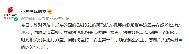 國航:已對國航CA1921航班螺絲松動情況進(jìn)行維修
