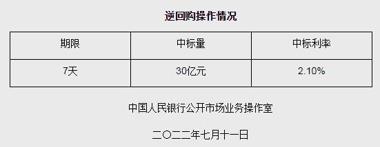 中新網(wǎng)7月11日電 據(jù)中國(guó)人民銀行網(wǎng)站消息,為維護(hù)銀行體系流動(dòng)性合理充裕,2022年7月11日人民銀行以利率招標(biāo)方式開展了30億元逆回購(gòu)操作,中標(biāo)利率2.10%。(中新財(cái)經(jīng))