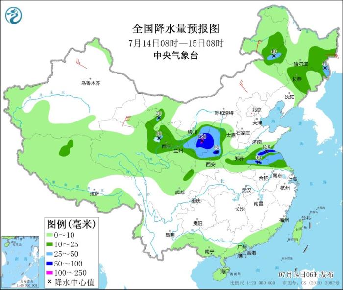 預(yù)計(jì),7月14日08時(shí)至15日08時(shí),西北地區(qū)東部、江蘇北部、安徽北部等地部分地區(qū)有大到暴雨,其中,甘肅東部、陜西北部等地局地有大暴雨(100~120毫米)。上述部分地區(qū)伴有短時(shí)強(qiáng)降水(最大小時(shí)降雨量20~50毫米,局地可超過(guò)60毫米),局地有雷暴大風(fēng)等強(qiáng)對(duì)流天氣。中央氣象臺(tái)7月14日06時(shí)發(fā)布暴雨藍(lán)色預(yù)警。
