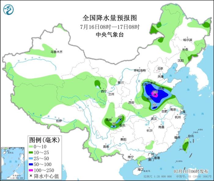 7月16日08時(shí)至17日08時(shí),華北南部、黃淮大部、江淮大部、四川盆地南部、臺(tái)灣島中南部等地部分地區(qū)有中到大雨,其中,山西東南部、河北南部、山東西部、河南東北部和南部、安徽北部、江蘇北部等地部分地區(qū)有暴雨或大暴雨(100~150毫米)。