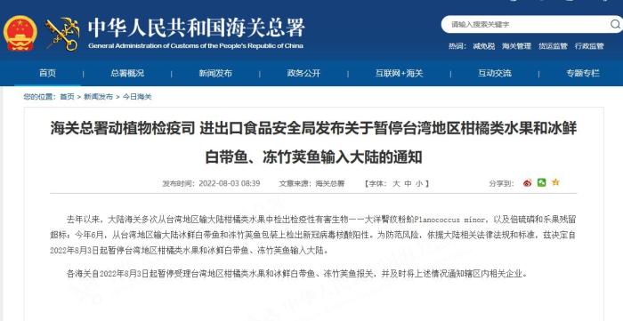 海關(guān)總署:暫停臺(tái)灣地區(qū)柑橘類水果和冰鮮白帶魚、凍竹莢魚輸入大陸