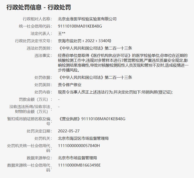 據(jù)信用中國(北京)網(wǎng)站5月31日行政處罰信息顯示,北京金準(zhǔn)醫(yī)學(xué)檢驗(yàn)實(shí)驗(yàn)室有限公司在近期的核酸檢測工作中,違規(guī)對多管樣本進(jìn)行3管混管檢測,嚴(yán)重違反質(zhì)量安全規(guī)定,影響檢測結(jié)果準(zhǔn)確性,導(dǎo)致對核酸檢測陽性人員發(fā)現(xiàn)和管控不及時,造成疫情進(jìn)一步傳播風(fēng)險。北京市海淀區(qū)市場監(jiān)督管理局決定吊銷其執(zhí)照(登記證)。(中新財經(jīng))