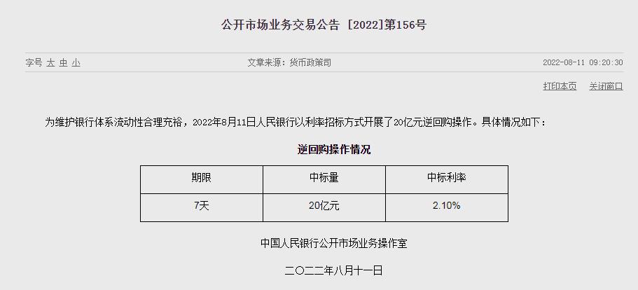 央行8月11日進(jìn)行20億元7天期逆回購操作