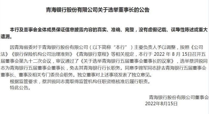 青海銀行主要負(fù)責(zé)人調(diào)整:選舉蔡洪銳為董事長