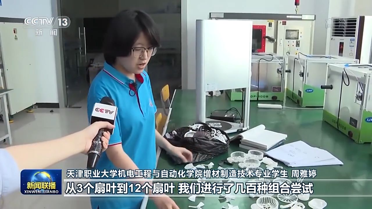 天津職業(yè)大學(xué)機(jī)電工程與自動化學(xué)院增材制造技術(shù)專業(yè)學(xué)生 周雅婷:這些都是我們通過3D打印打印出來的,從3個扇葉到12個扇葉,我們進(jìn)行了幾百種組合嘗試。如果差0.1毫米的話,可能會導(dǎo)致風(fēng)扇卡住。