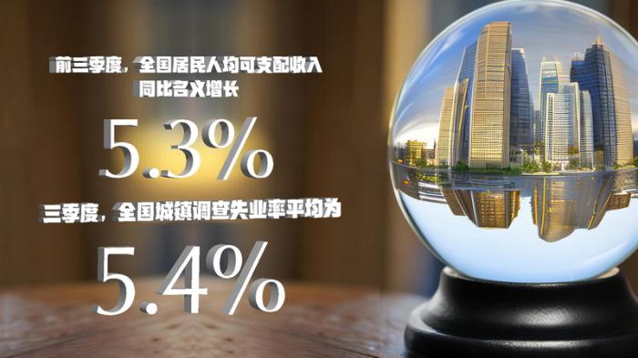 就業(yè)形勢總體穩(wěn)定,居民收入平穩(wěn)增長。前三季度,全國城鎮(zhèn)調(diào)查失業(yè)率平均為5.6%,其中三季度平均為5.4%,比二季度下降0.4個百分點(diǎn)。全國居民人均可支配收入27650元,同比名義增長5.3%;扣除價格因素實(shí)際增長3.2%,比上半年加快0.2個百分點(diǎn);全國居民人均可支配收入中位數(shù)23277元,同比名義增長5.1%。
