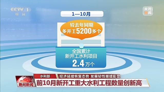 水利部今天發(fā)布數(shù)據(jù)顯示:1—10月,全國(guó)累計(jì)新開工水利項(xiàng)目2.4萬個(gè),較去年同期多開工5200多個(gè),其中新開工重大水利工程45項(xiàng),創(chuàng)歷史新高。