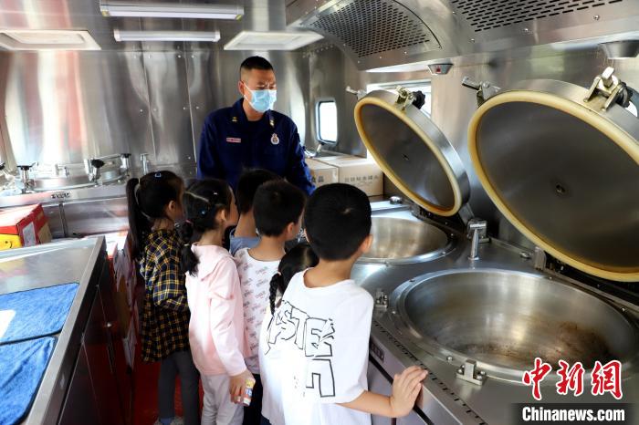 消防員帶領(lǐng)小朋友們參觀炊事車?!〔淘鲂?攝