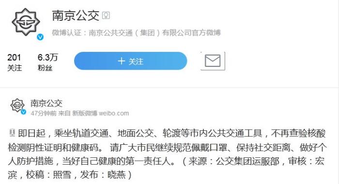 南京:5日起,乘坐市內(nèi)公共交通工具不再查驗(yàn)核酸證明和健康碼