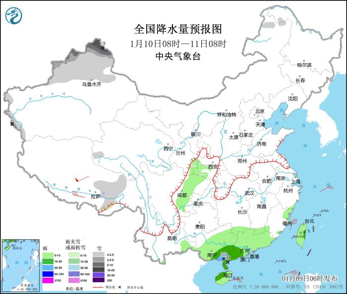 1月9日08時至10日08時,新疆北部和西部山區(qū)、西藏西部等地部分地區(qū)有小到中雪,其中,新疆北疆北部、西藏西部局地有大到暴雪(10~18毫米)。江南中南部、華南大部、臺灣島等地部分地區(qū)有小到中雨,其中,廣東東北部和西南部沿海、海南島北部等地局地有大雨(25~45毫米)。西藏中西部等地部分地區(qū)有5~7級風(見圖1)。
