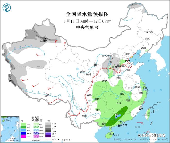 1月11日08時至12日08時,黑龍江西北部、新疆北部和西部、陜西北部、山西等地部分地區(qū)有小到中雪或雨夾雪,其中,新疆沿天山地區(qū)、西藏西部等地部分地區(qū)有大到暴雪(10~18毫米)。西北地區(qū)東南部、河南南部、江漢、江南大部、西南地區(qū)東部、華南、臺灣島等地部分地區(qū)有小到中雨,局地有大雨(25~40毫米)。新疆南疆盆地、西藏等地部分地區(qū)有4~6級風,其中,西藏北部和西部等地部分地區(qū)有7~8級風,新疆東部部分地區(qū)有8~9級風(見圖3)。