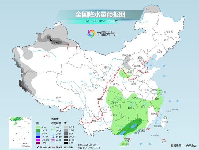 明天,隨著補(bǔ)充弱冷空氣南下,暖濕氣流增強(qiáng),我國中東部雨雪天氣將增多,其中黑龍江西北部、新疆北部和西部山區(qū)、西藏西部、陜西北部、山西中北部等地部分地區(qū)有小到中雪或雨夾雪,其中,新疆沿天山地區(qū)、西藏西部等地局地有大到暴雪。江漢南部、江南大部、西南地區(qū)東部、華南等地部分地區(qū)有小到中雨,局地有大雨。