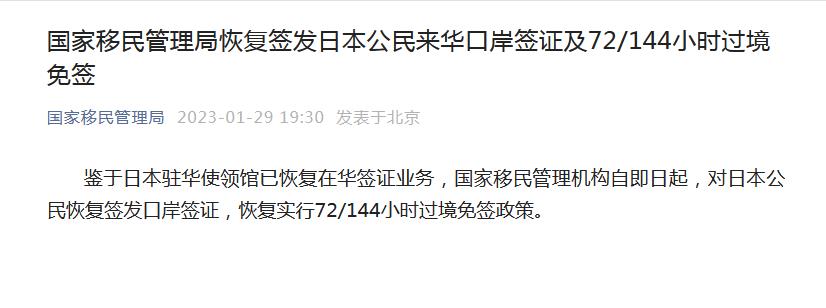 國家移民管理局恢復(fù)簽發(fā)日本公民來華口岸簽證及72/144小時(shí)過境免簽