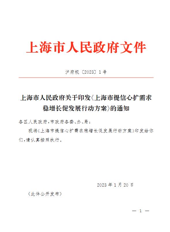 中新網(wǎng)1月29日電 據(jù)上海發(fā)布微信公眾號(hào)29日消息,為全面貫徹黨的二十大和中央經(jīng)濟(jì)工作會(huì)議精神,落實(shí)市第十二次黨代會(huì)和十二屆市委二次全會(huì)部署,抓牢高質(zhì)量發(fā)展首要任務(wù),大力提振市場(chǎng)預(yù)期和信心,推動(dòng)經(jīng)濟(jì)社會(huì)發(fā)展開(kāi)好局起好步,近期上海市制定了《上海市提信心擴(kuò)需求穩(wěn)增長(zhǎng)促發(fā)展行動(dòng)方案》(以下簡(jiǎn)稱(chēng)《行動(dòng)方案》)。