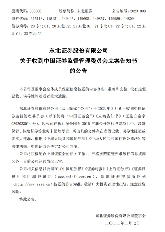 中新網(wǎng)2月7日電 7日,東北證券發(fā)公告稱,東北證券股份有限公司于2023年2月6日收到中國證券監(jiān)督管理委員會《立案告知書》(證監(jiān)立案字 0392023014 號)。因公司在執(zhí)行豫金剛石2016年非公開發(fā)行股票項目中,涉嫌保薦、持續(xù)督導等業(yè)務未勤勉盡責,所出具的文件存在虛假記載、誤導性陳述或者重大遺漏,根據(jù)相關(guān)法律法規(guī),中國證監(jiān)會決定對公司立案。(中新財經(jīng))