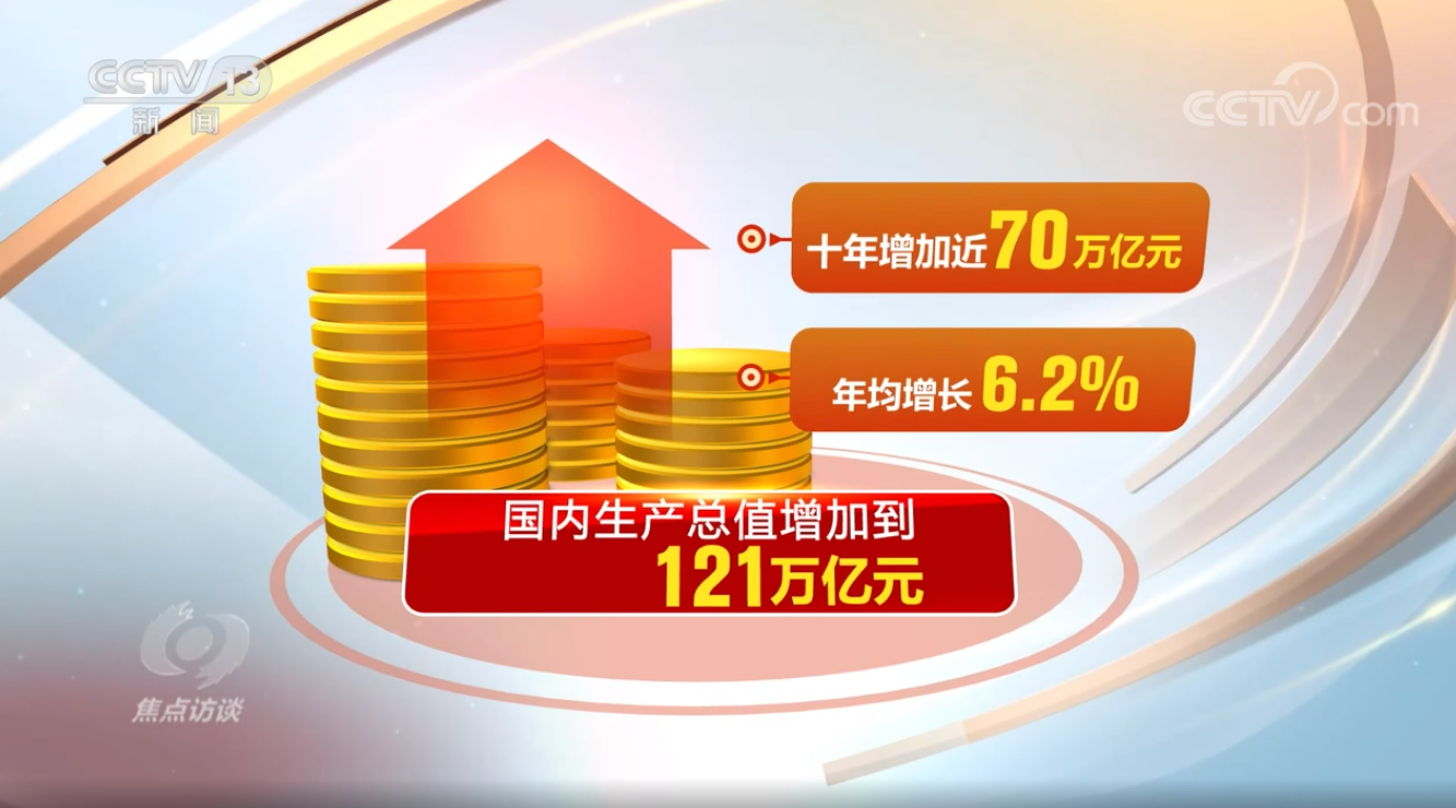 這五年,我國經(jīng)濟(jì)發(fā)展再上新臺階。國內(nèi)生產(chǎn)總值增加到121萬億元,五年年均增長5.2%,十年增加近70萬億元、年均增長6.2%,在高基數(shù)基礎(chǔ)上實(shí)現(xiàn)了中高速增長、邁向高質(zhì)量發(fā)展。