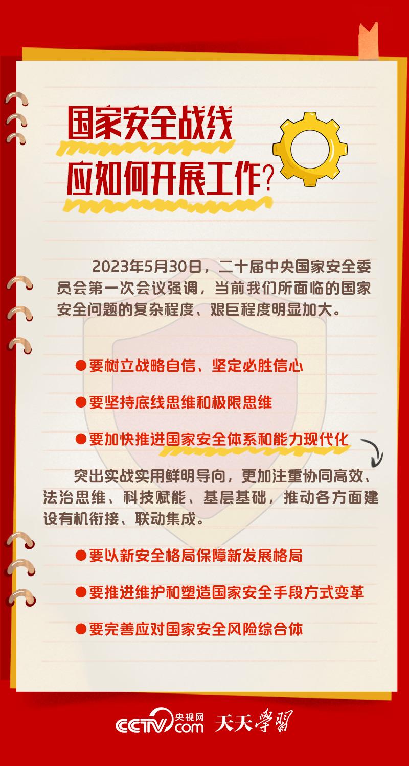 天天學(xué)習(xí) 5月30日,習(xí)近平總書(shū)記主持召開(kāi)二十屆中央國(guó)家安全委員會(huì)第一次會(huì)議時(shí)強(qiáng)調(diào),要全面貫徹黨的二十大精神,深刻認(rèn)識(shí)國(guó)家安全面臨的復(fù)雜嚴(yán)峻形勢(shì),正確把握重大國(guó)家安全問(wèn)題,加快推進(jìn)國(guó)家安全體系和能力現(xiàn)代化,以新安全格局保障新發(fā)展格局,努力開(kāi)創(chuàng)國(guó)家安全工作新局面。