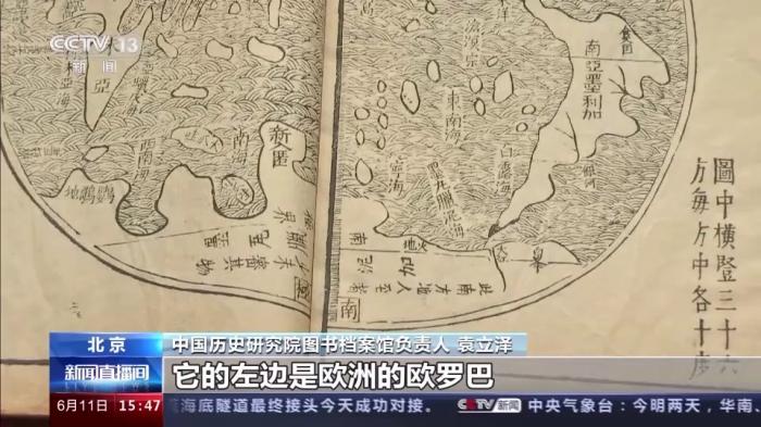 中國歷史研究院圖書檔案館負責人 袁立澤:這幅圖是16世紀末,西方第一批來華傳教士利瑪竇主持繪制的。把西方當時先進的制圖技術(shù)帶到了中國,同時他有意識地吸收了中國的制圖經(jīng)驗和理念。今天我們所熟悉的七大洲四大洋,在圖中應(yīng)該說已經(jīng)標示出了六大洲和三大洋,就是亞洲的亞細亞。它的左邊是歐洲的歐羅巴,南面就是今天的非洲叫利未亞,改變了以往以歐洲為中心的繪圖方式。它是中西文明交流互鑒的一個結(jié)晶和有力見證。