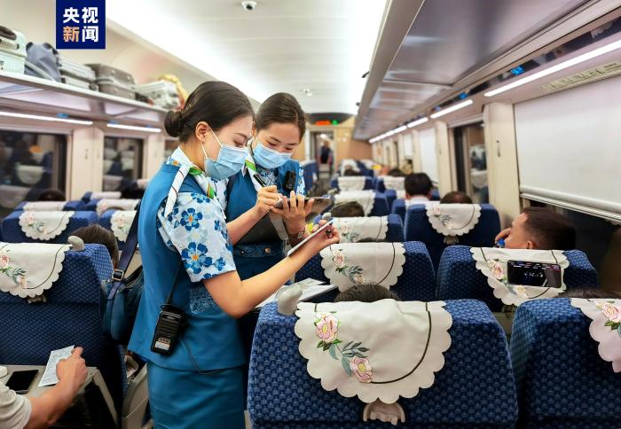 “列車上備有足夠的出入境卡,便于旅客在填錯時能夠及時更換,乘務(wù)人員也會指導(dǎo)填寫,對于老年旅客或者使用手機不太順暢的旅客,我們會幫著完成出入境申報,讓他們的出行體驗更加便捷、溫馨?!敝欣翔F路國際旅客列車乘務(wù)指導(dǎo)兼列車長代蕊說。