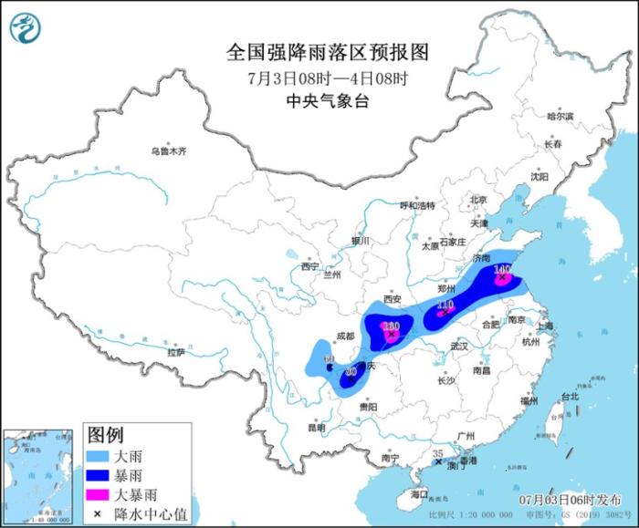 7月3日08時至4日08時,山東中南部、江蘇北部、安徽北部、河南東部和南部、湖北北部和西部、陜西南部、重慶、四川東部、貴州西北部、云南東北部以及廣東西南部沿海等地部分地區(qū)有大到暴雨,其中,山東南部、江蘇北部、河南南部、重慶北部、四川東北部等地局地有大暴雨(100~160毫米)。內(nèi)蒙古中西部、甘肅中北部、青海北部等地部分地區(qū)有4~6級風。