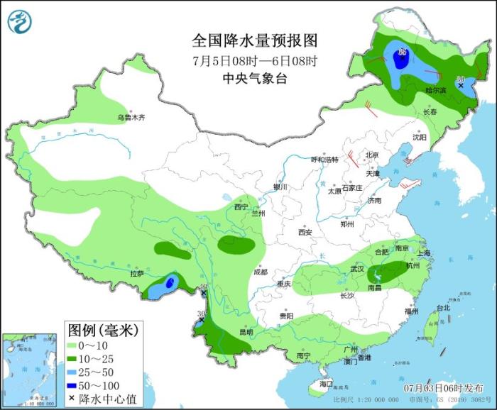 7月4日08時至5日08時,內(nèi)蒙古東部、黑龍江南部、吉林、遼寧以及蘇皖南部、湖北西南部、湖南北部、廣東南部、廣西北部和西部、云南大部、西藏東南部等地部分地區(qū)有中到大雨,其中,內(nèi)蒙古東北部、黑龍江西南部、吉林中西部、遼寧中東部、西藏東南部等地部分地區(qū)有暴雨或大暴雨(100~120毫米)。內(nèi)蒙古、華北北部和西部、黃淮東部、東北地區(qū)南部等地部分地區(qū)有4~6級風。