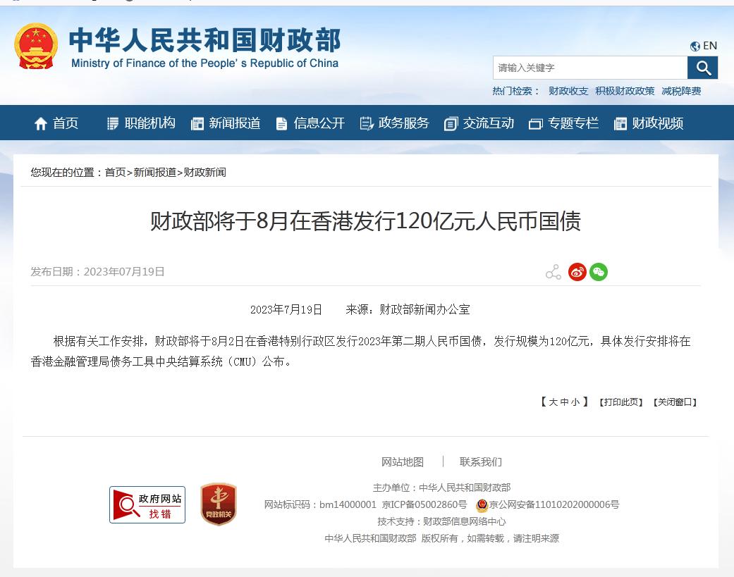 財(cái)政部將于8月在香港發(fā)行120億元人民幣國債