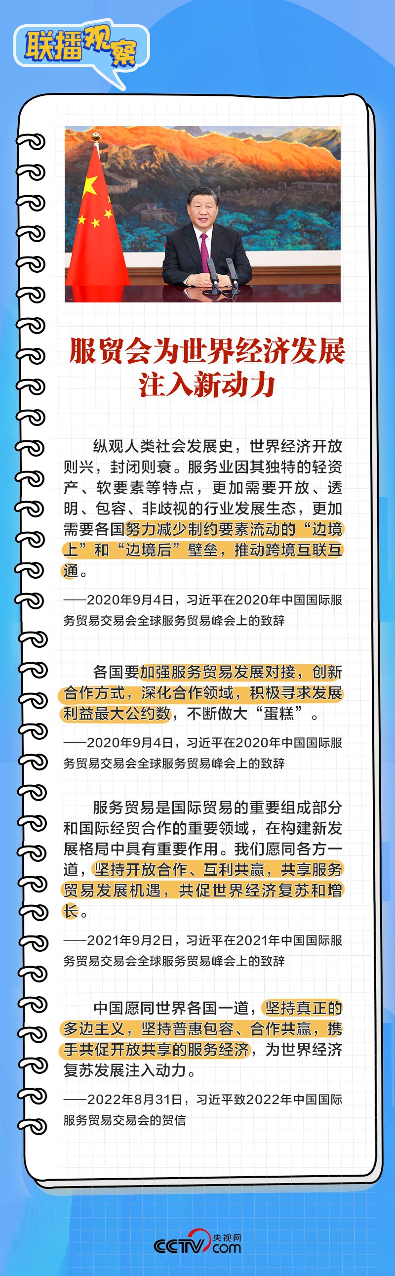 |聯(lián)播+|“當(dāng)前,百年變局加速演進(jìn),世界經(jīng)濟(jì)復(fù)蘇動力不足。服務(wù)貿(mào)易是國際貿(mào)易的重要組成部分,服務(wù)業(yè)是國際經(jīng)貿(mào)合作的重要領(lǐng)域”。9月2日上午,習(xí)近平主席在北京向2023年中國國際服務(wù)貿(mào)易交易會全球服務(wù)貿(mào)易峰會發(fā)表視頻致辭。