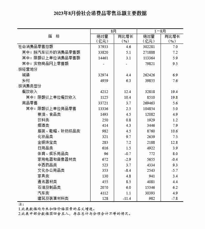 國家統(tǒng)計局:2023年8月份社會消費品零售總額增長4.6%