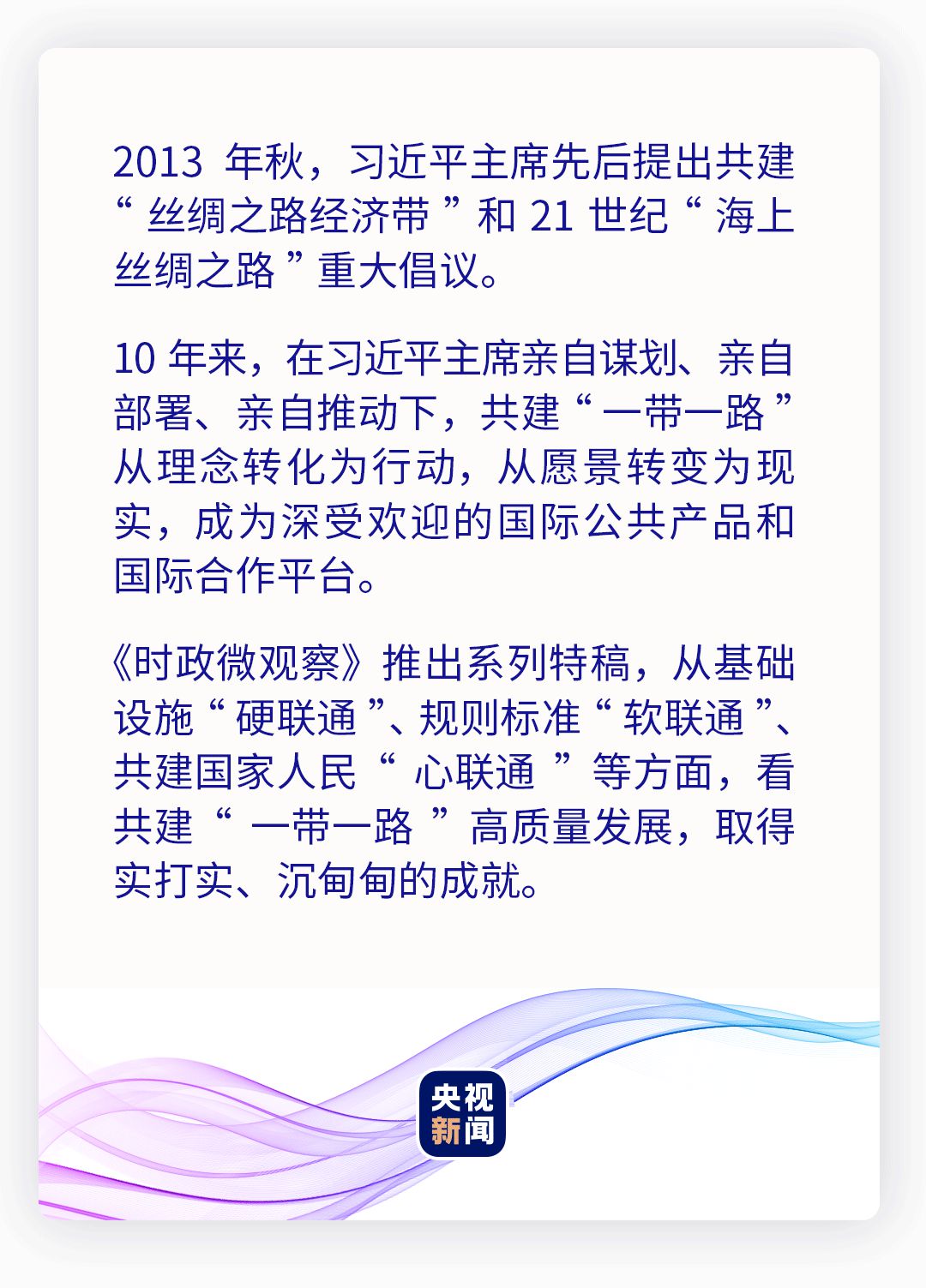 民相親在于心相通。民心相通,是最基礎(chǔ)、最堅(jiān)實(shí)、最持久的互聯(lián)互通。10年來,一個(gè)個(gè)項(xiàng)目在共建“一帶一路”國家落地開花,拉近了各國人民的心。