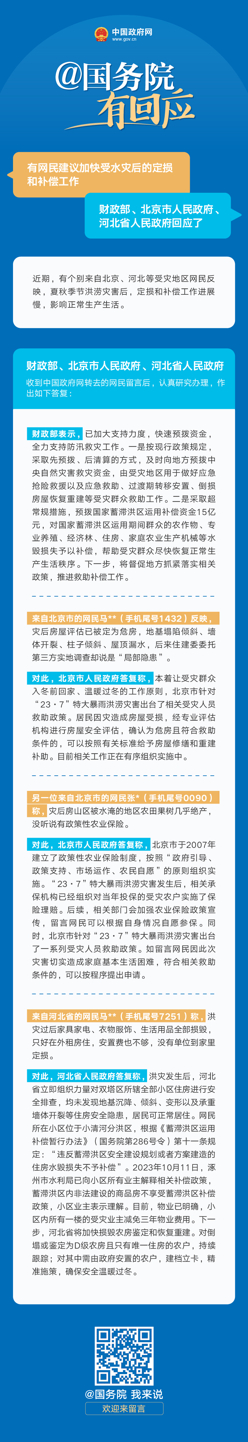 財政部、北京市人民政府、河北省人民政府答網(wǎng)民關于“建議加快受水災后的定損和補償工作”的留言