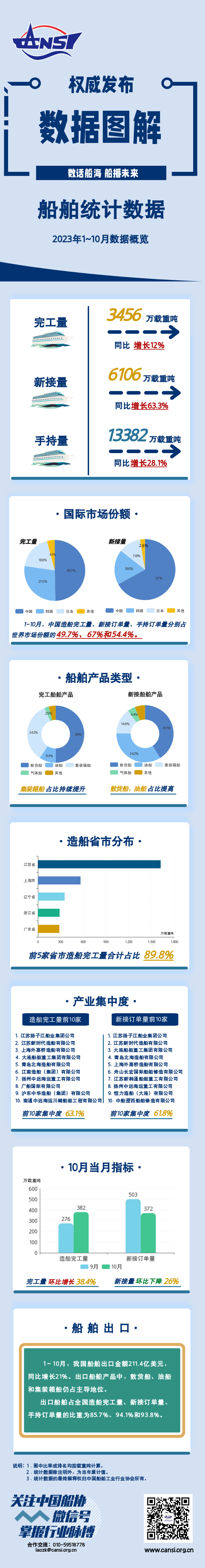 1-10月,我國(guó)船舶出口金額211.4億美元,同比增長(zhǎng)21%。出口船舶產(chǎn)品中,散貨船、油船和集裝箱船仍占主導(dǎo)地位。出口船舶占全國(guó)造船完工量、新接訂單量、手持訂單量的比重為85.7%、94.1%和93.8%。