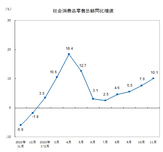 國家統(tǒng)計局:11月份社會消費(fèi)品零售總額增長10.1%