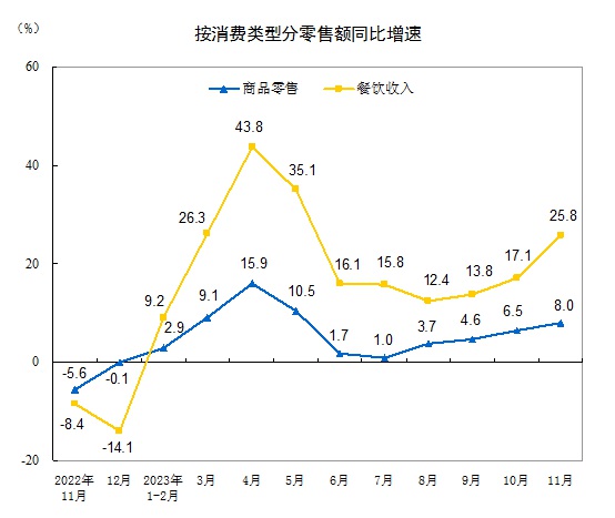 按消費(fèi)類型分,11月份,商品零售36925億元,同比增長8.0%;餐飲收入5580億元,增長25.8%。1—11月份,商品零售380460億元,同比增長5.9%;餐飲收入47485億元,增長19.4%。