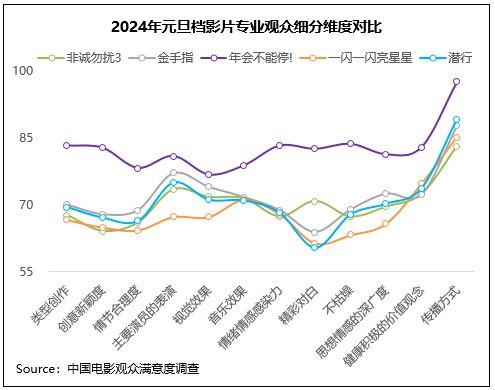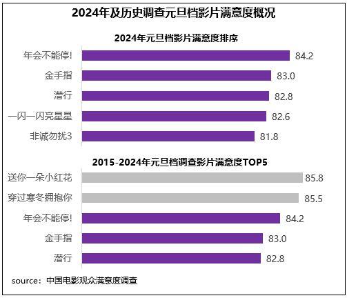 中國電影觀眾滿意度調(diào)查 2024年元旦檔調(diào)查結(jié)果顯示,元旦檔電影觀眾滿意度得分83.0分,環(huán)比增長0.2分。檔期以多元化且高契合度的影片供給陪伴觀眾跨年,得到了較高的滿意度評價,5部影片中有4部進入歷史調(diào)查19部元旦檔影片的滿意度前十,喜劇《年會不能停!》以84.2分領(lǐng)銜,《金手指》83.0分居第二位,《潛行》《一閃一閃亮星星》均超82分,《非誠勿擾3》超81分。