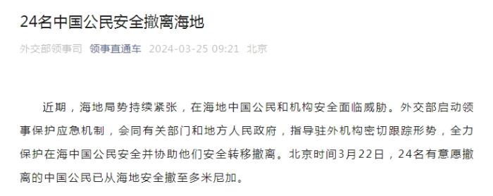 中新網(wǎng)3月25日電 據(jù)外交部領(lǐng)事司微信公眾號“領(lǐng)事直通車”25日消息,近期,海地局勢持續(xù)緊張,在海地中國公民和機構(gòu)安全面臨威脅。外交部啟動領(lǐng)事保護(hù)應(yīng)急機制,會同有關(guān)部門和地方人民政府,指導(dǎo)駐外機構(gòu)密切跟蹤形勢,全力保護(hù)在海中國公民安全并協(xié)助他們安全轉(zhuǎn)移撤離。北京時間3月22日,24名有意愿撤離的中國公民已從海地安全撤至多米尼加。