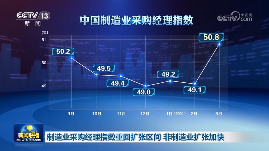 中國(guó)物流與采購聯(lián)合會(huì)、國(guó)家統(tǒng)計(jì)局服務(wù)業(yè)調(diào)查中心今天(3月31日)公布3月份中國(guó)采購經(jīng)理指數(shù)。制造業(yè)采購經(jīng)理指數(shù)重回?cái)U(kuò)張區(qū)間,景氣水平明顯提升,非制造業(yè)繼續(xù)加快擴(kuò)張。