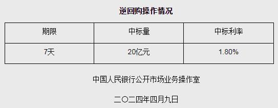 中新網(wǎng)4月9日電 據(jù)中國人民銀行網(wǎng)站消息,為維護(hù)銀行體系流動性合理充裕,2024年4月9日人民銀行以利率招標(biāo)方式開展了20億元逆回購操作。具體情況如下: