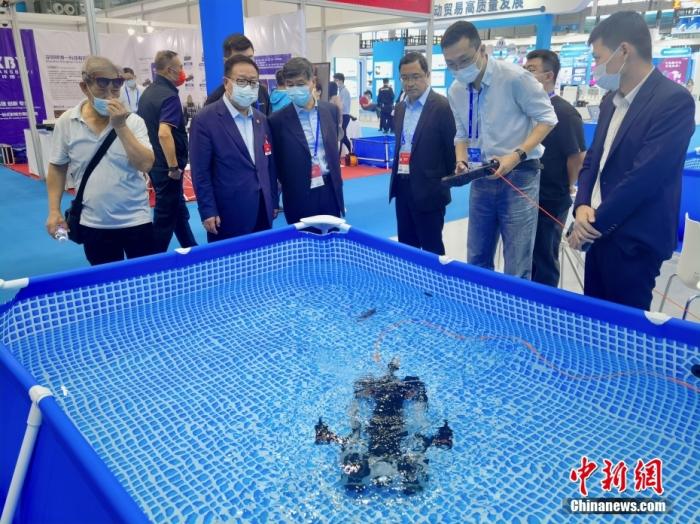 資料圖:2022年11月16日,在深圳舉行的第二十四屆中國(guó)國(guó)際高新技術(shù)成果交易會(huì)上,參展商攜“黑科技”產(chǎn)品亮相高交會(huì)。圖為深圳企業(yè)研制的潛鮫P200 PRO行業(yè)級(jí)水下機(jī)器人。 中新社記者 陳文 攝