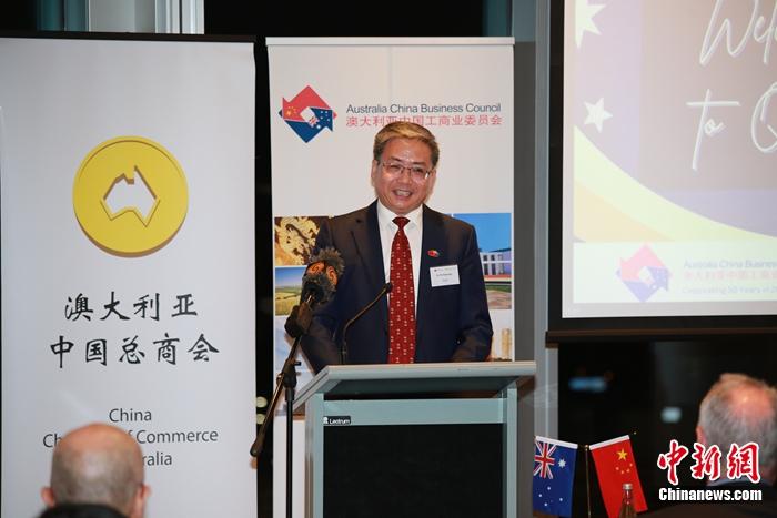 當?shù)貢r間3月30日晚,由澳中工商業(yè)委員會昆州分會(ACBC QLD)和澳大利亞中國總商會布里斯班分會(CCCA BNE)聯(lián)合舉辦澳中工商界歡迎酒會,歡迎中國駐澳大利亞大使肖千到訪昆士蘭州。圖為澳大利亞中國工商總會布里斯班分會會長蒲海洋在會上發(fā)言。中新社記者 顧時宏 攝