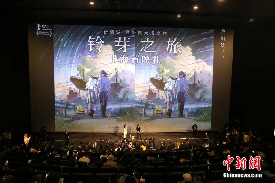 導(dǎo)演新海誠攜最新電影《鈴芽之旅》在上海萬達影城舉行首映式。陳玉宇 攝