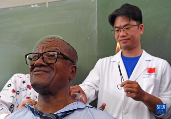 4月3日,在納米比亞溫得和克的伊曼紐爾·謝菲迪中學(xué)課堂上,校長卡奇翁瓜體驗拔火罐。新華社發(fā)(穆薩·卡薩克攝)