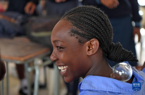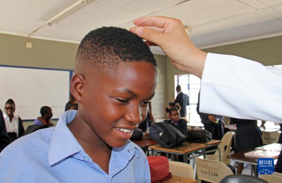 4月3日,在納米比亞溫得和克的伊曼紐爾·謝菲迪中學(xué)課堂上,一名學(xué)生體驗艾灸。新華社發(fā)(穆薩·卡薩克攝)