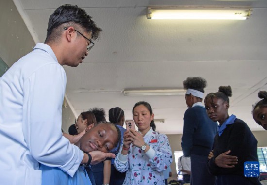 4月3日,在納米比亞溫得和克的伊曼紐爾·謝菲迪中學(xué)課堂上,一名學(xué)生體驗針灸。新華社發(fā)(穆薩·卡薩克攝)