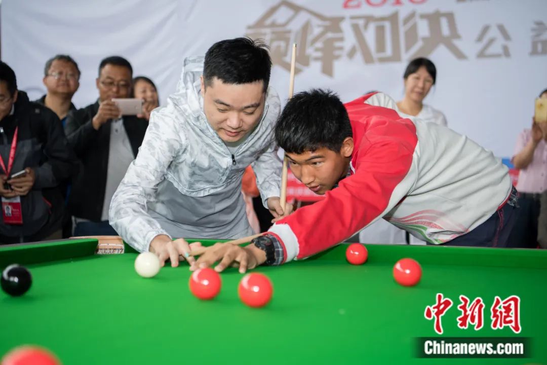 2018“瑞德”斯諾克“巔峰對決”公益活動在西藏啟幕,丁俊暉指導(dǎo)藏族學(xué)生打臺球。何蓬磊 攝