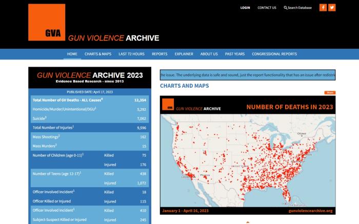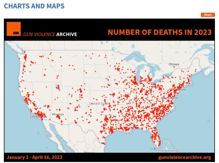 2023年1月1日至4月16日,美國槍支暴力事件分布圖。圖片來源:美國“槍支暴力檔案”網(wǎng)站截圖